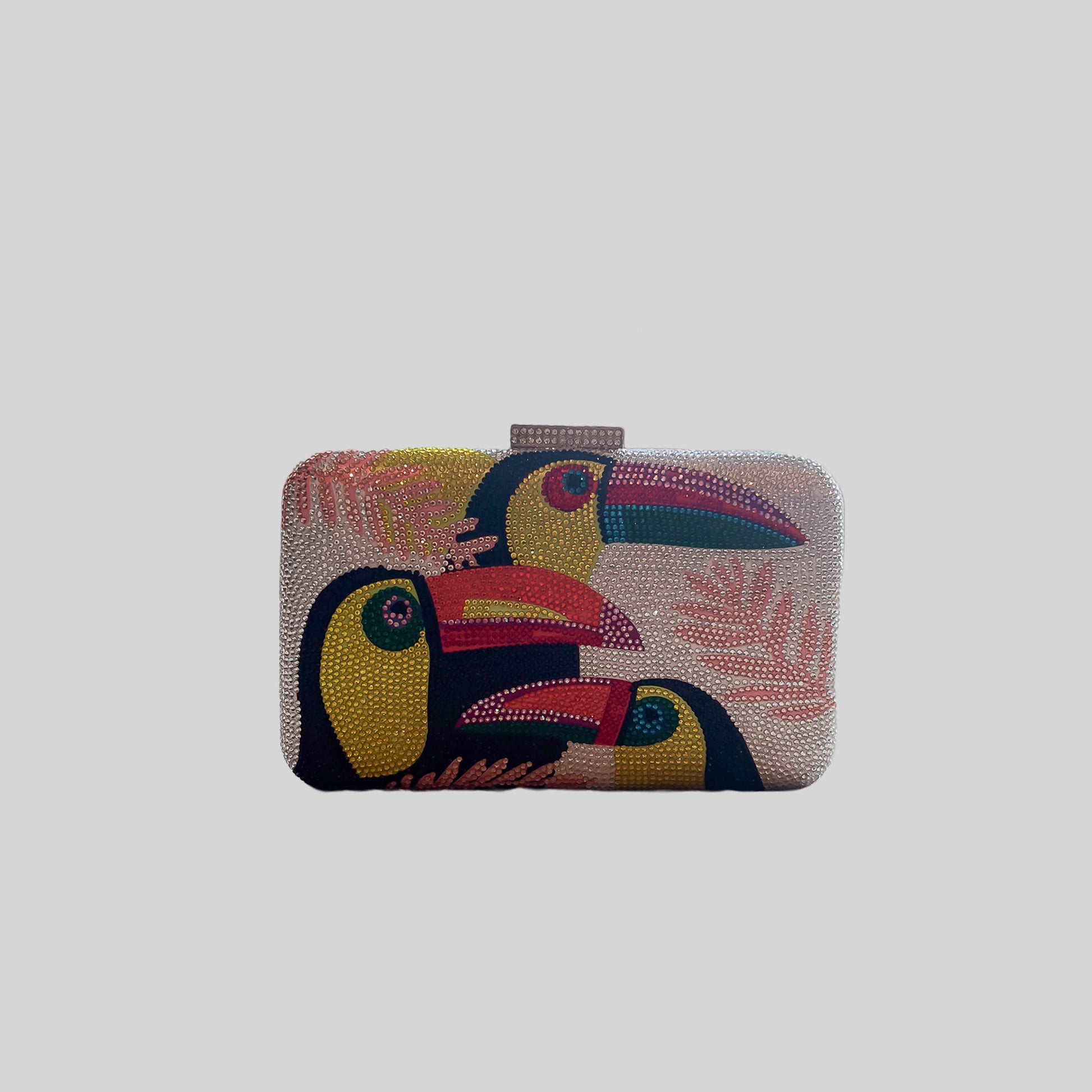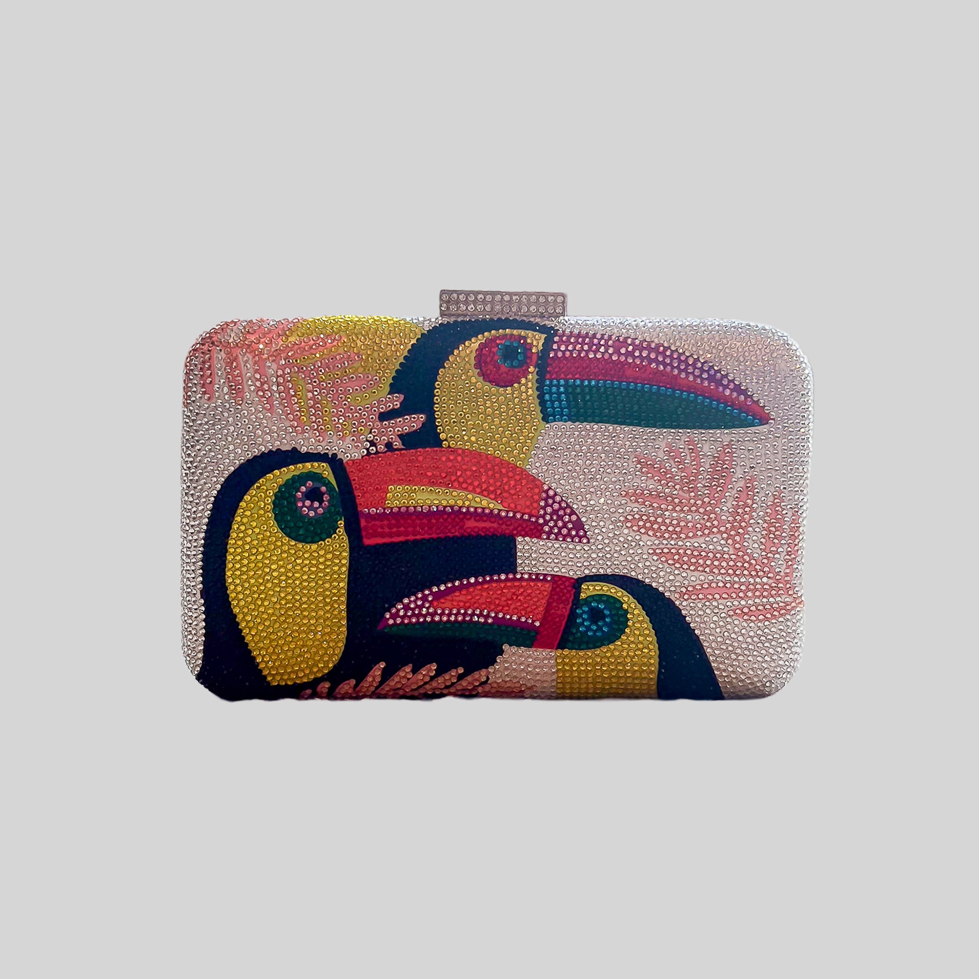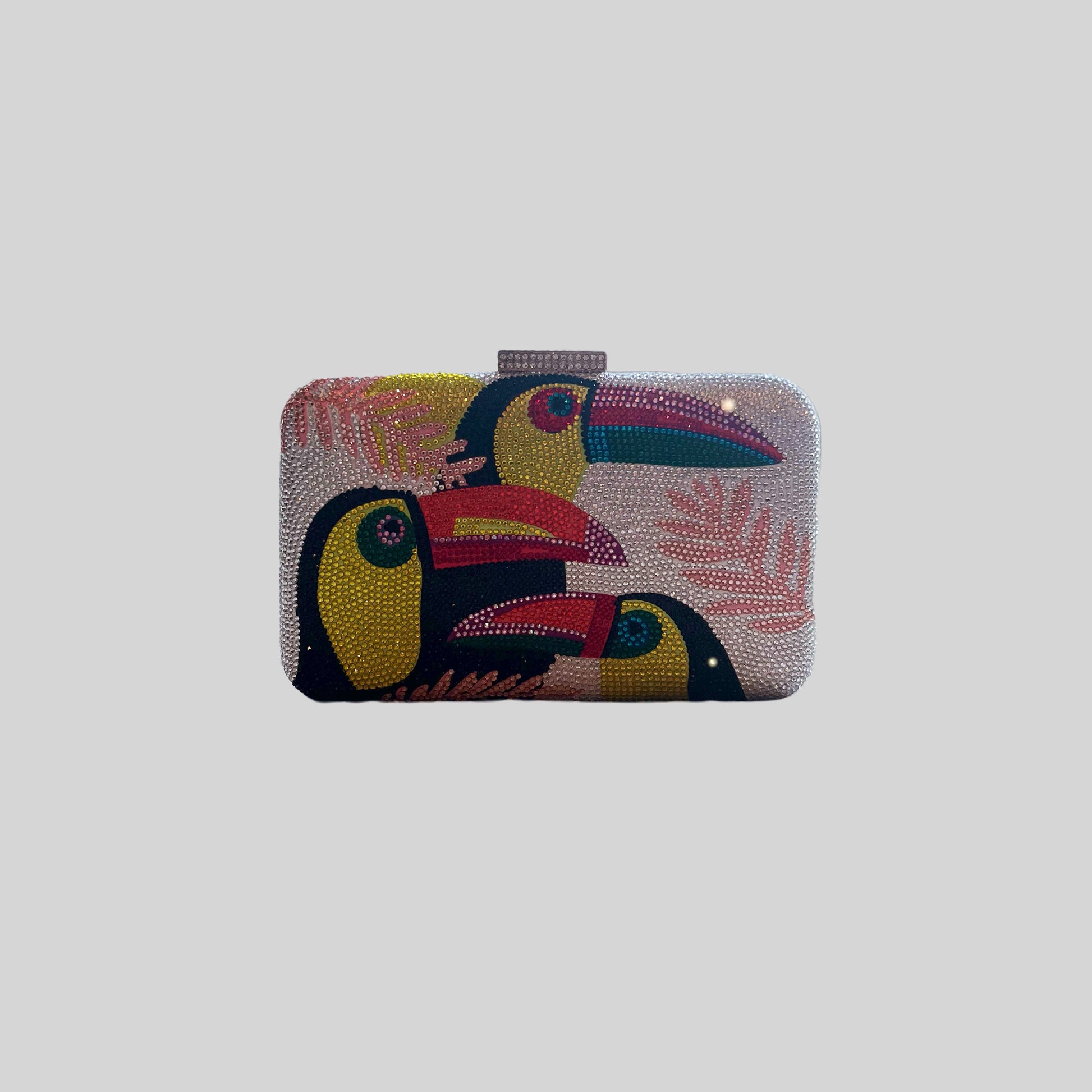 El clutch Amazonia, íntegramente cubierto de strass, destaca por su diseño de tucanes tropicales sobre fondo marino o plateado.