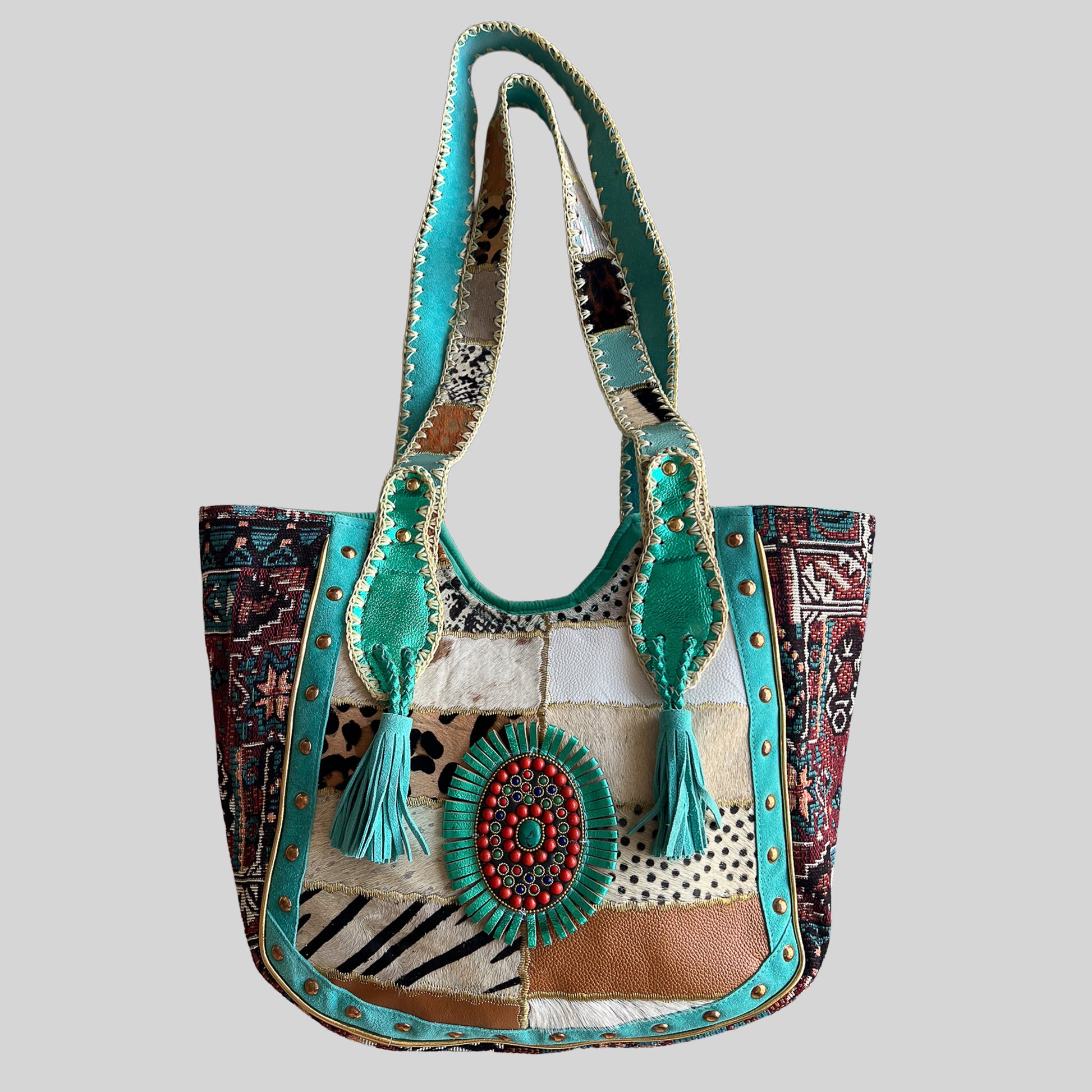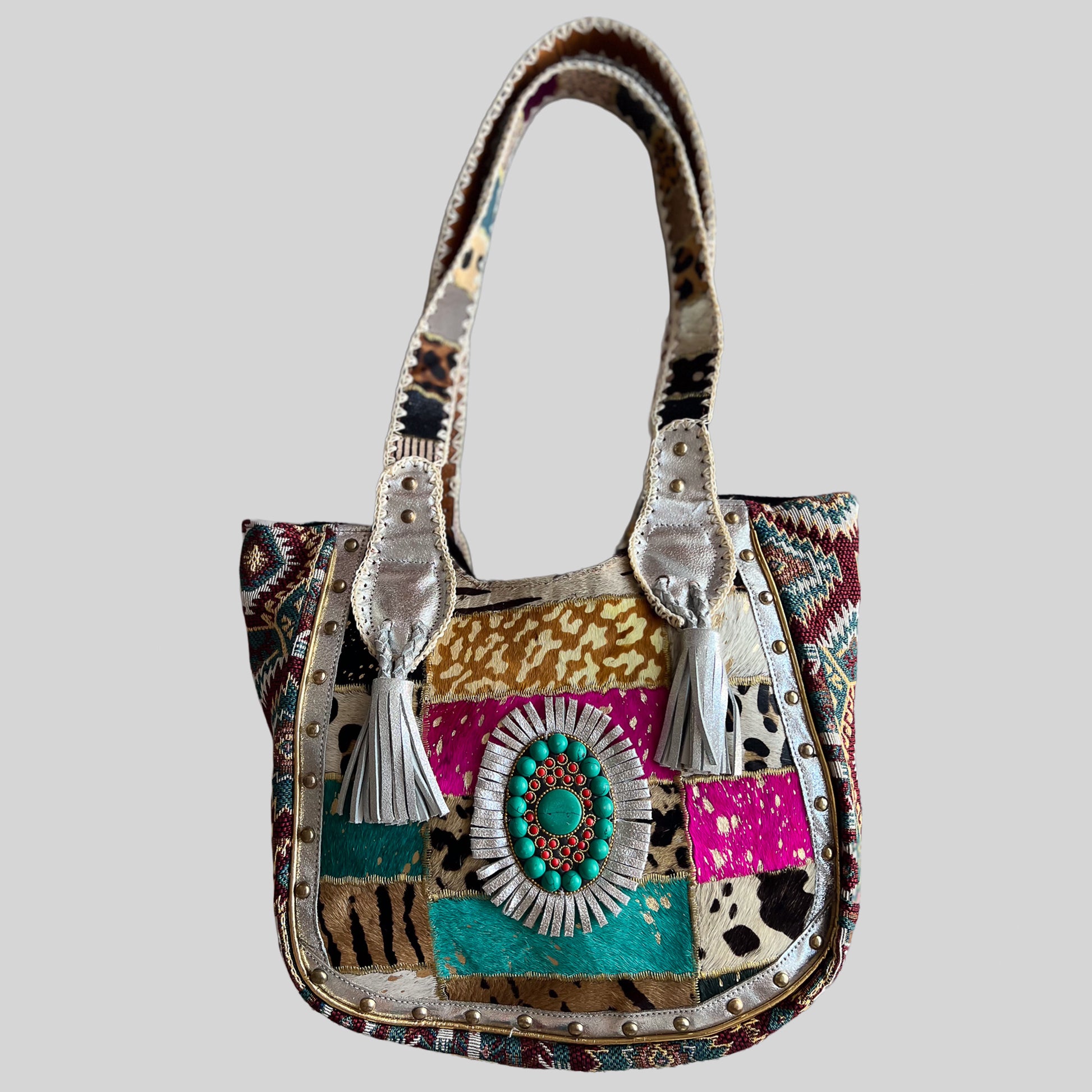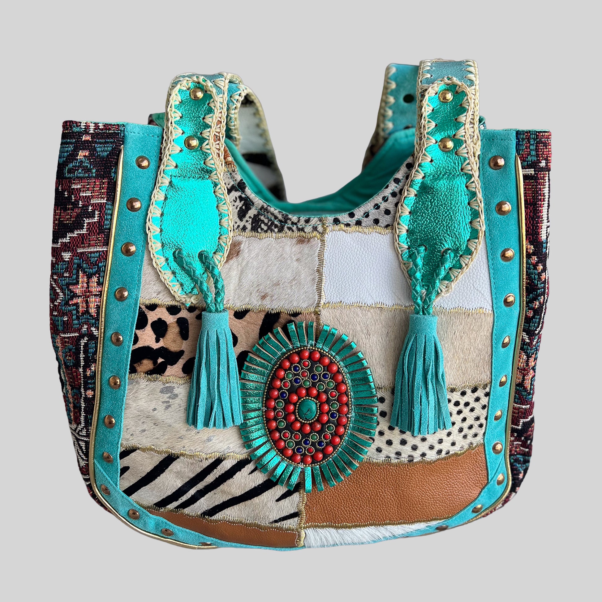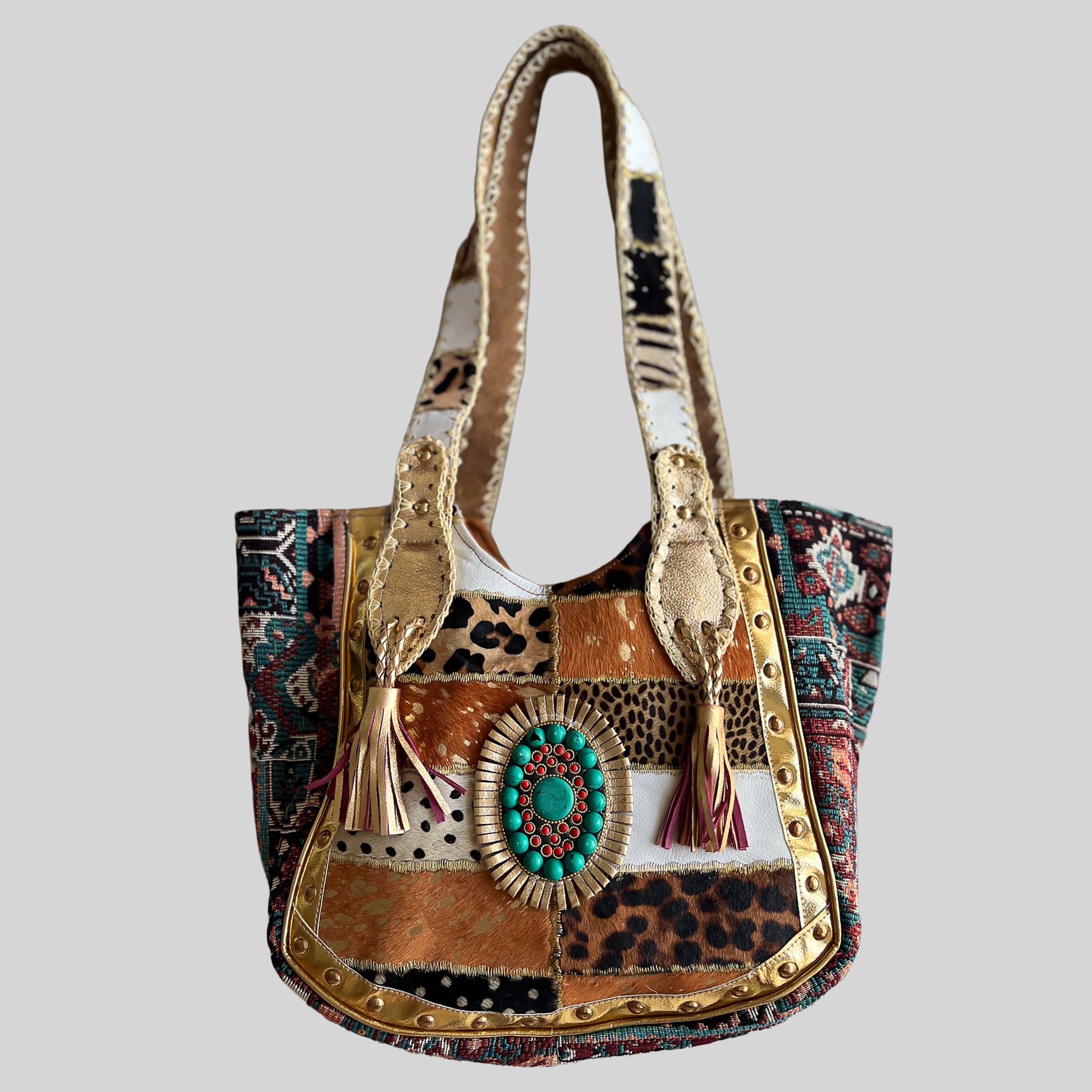 Confeccionado en cuero auténtico con pelo natural y detalles kilim bordados, su diseño celebra la belleza cruda de los paisajes áridos y el brillo dorado de la luna sobre la arena. Un bolso con alma de diosa nómada.